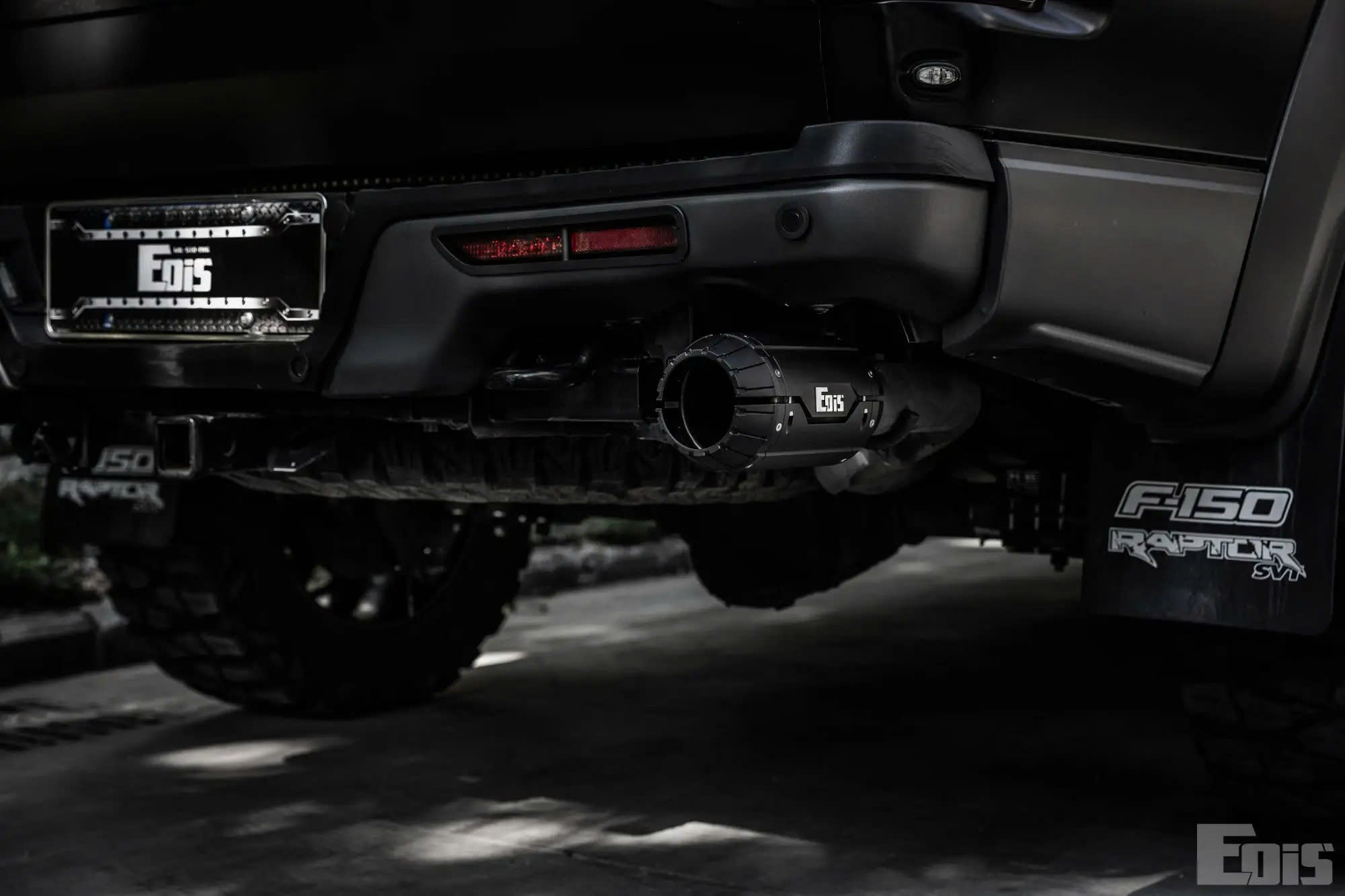Sản phẩm trong hình là Ốp Ống Xả (Tail Pipe Tip) nâng cấp từ thương hiệu Eois, được thiết kế để lắp đặt lên phần đuôi ống xả kép (dual exhaust) của dòng xe Ford F150 Raptor (đời 2017-2023).